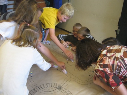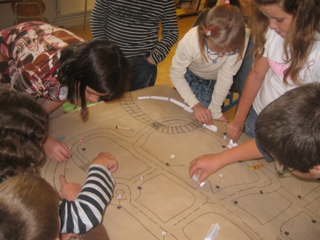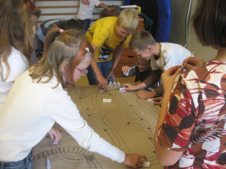 Se 4. a 5. ročníkem jsme si v pracovních činnostech vyrobili plánek silnic, křižovatek a kruhových objezdů. Děti vyrobily značky, auta, chodce, cyklisty atd. a mohla začít dopravní výchova. vložila R. Ilkaničová
