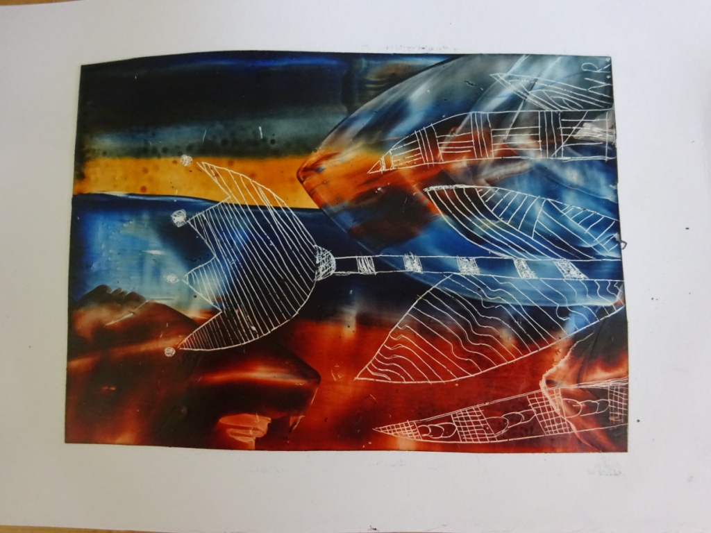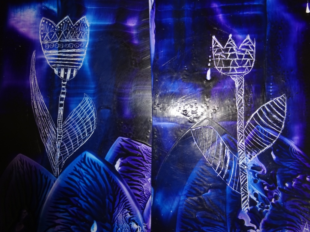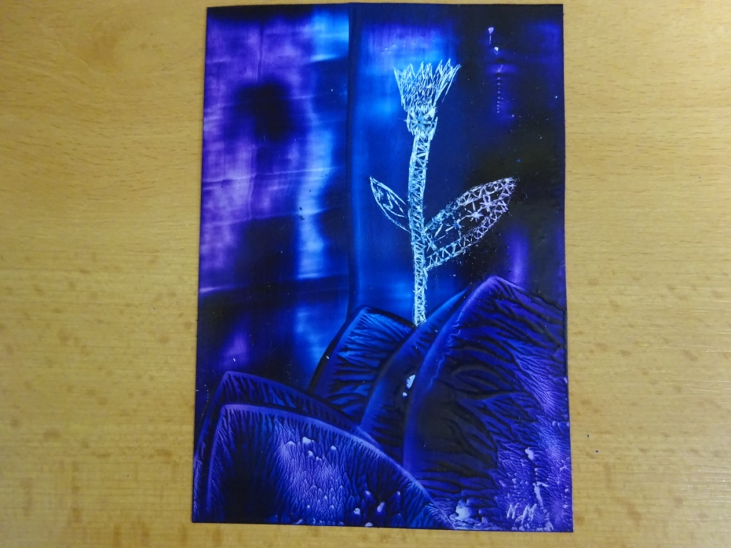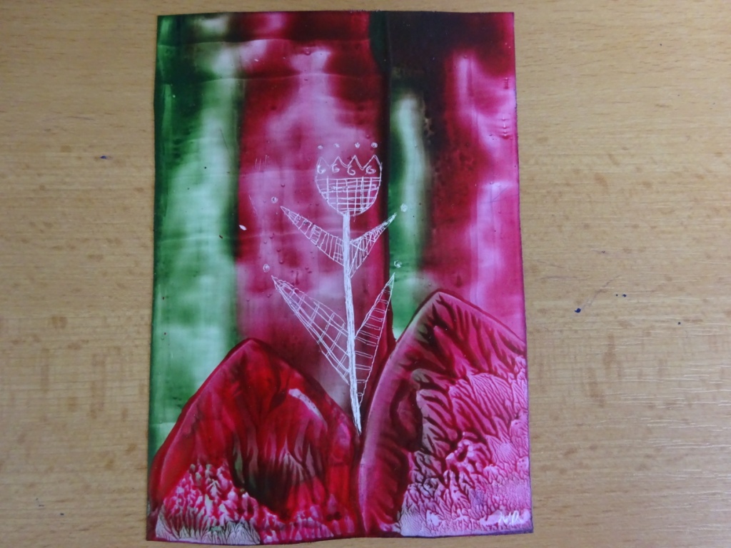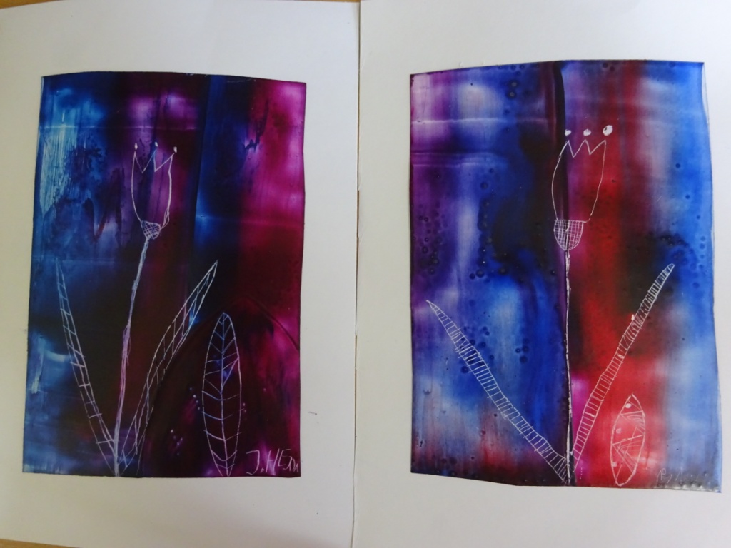 Enkaustika - malování roztavenými barevnými vosky za pomoci žehličky. Následně do enkaustického základu vyškrabávaná technika perem - květina. Práce 2. - 5. ročníku. R. Ilkaničová 24. 4. 2018