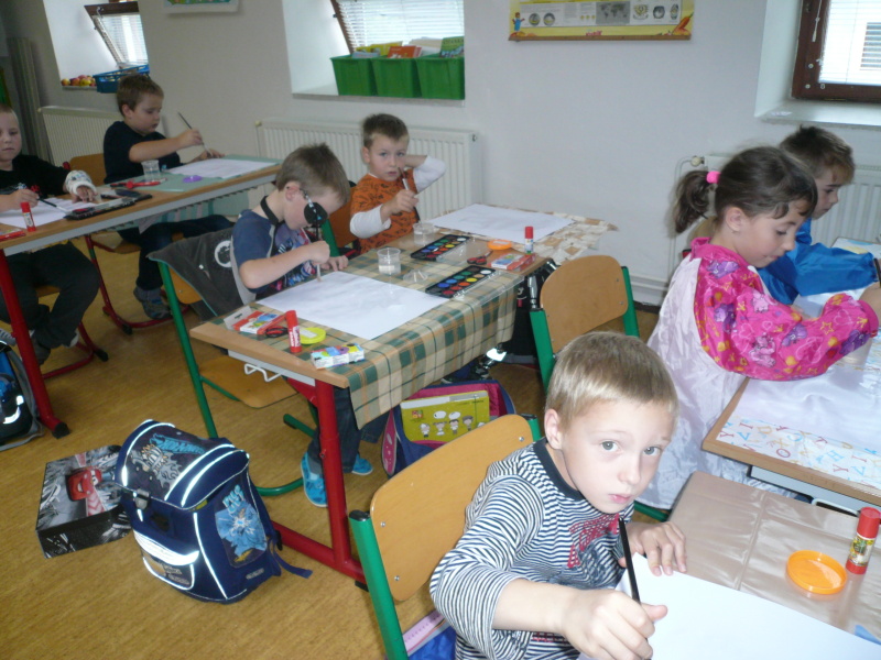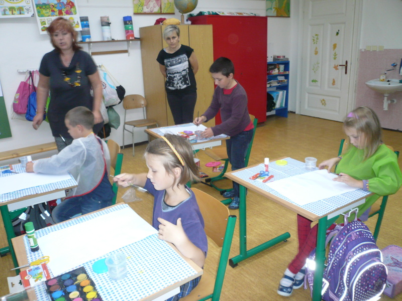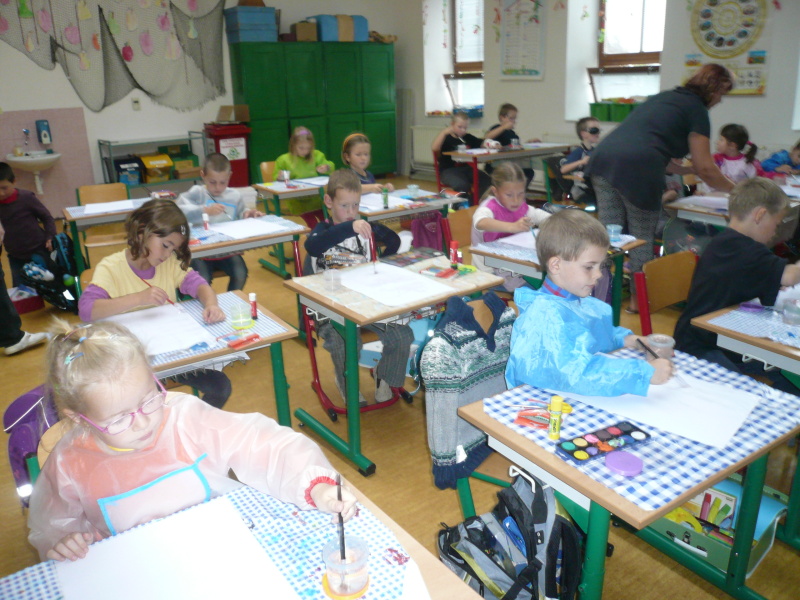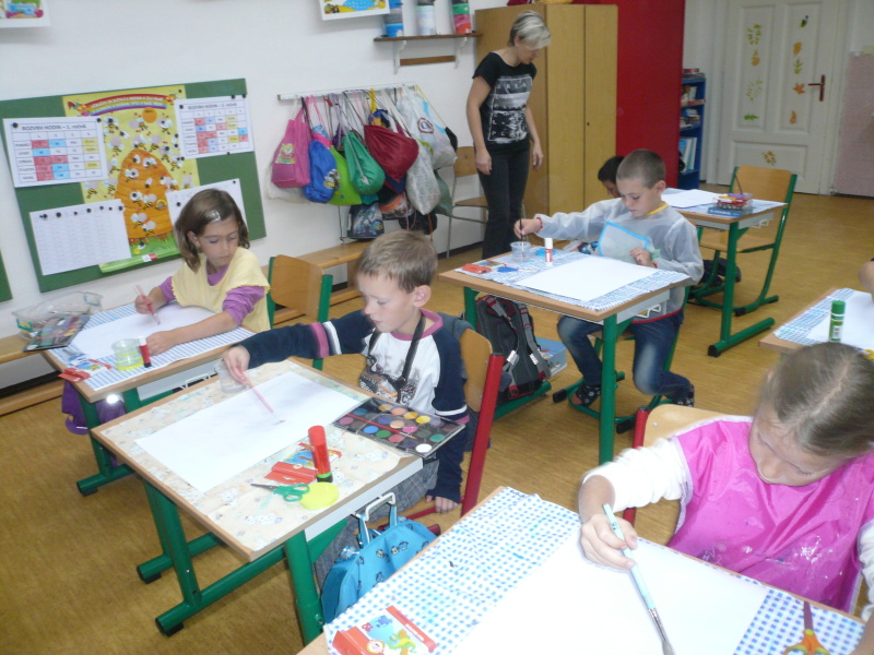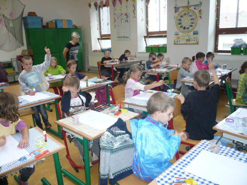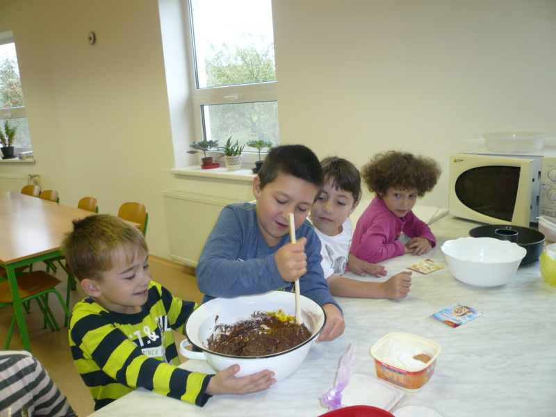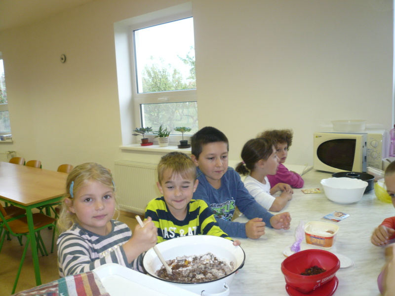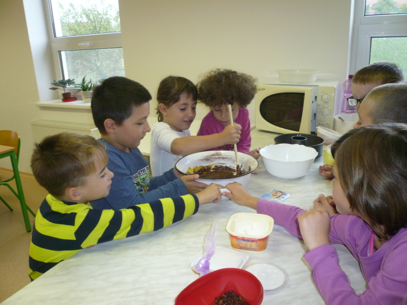 O přestávce děti z 1. a 2. ročníku pekly bábovku, ze které daly ochutnat i starším kamarádům. Děti v rámci prvouky hrály hru na ochutnávání ovoce a zeleniny. Povídaly si o jejich prospěšnosti ke zdraví a o tom, co sklízíme na podzim. Nakonec týdne se ve výtvarné výchově děti učily zapíjet barvy.