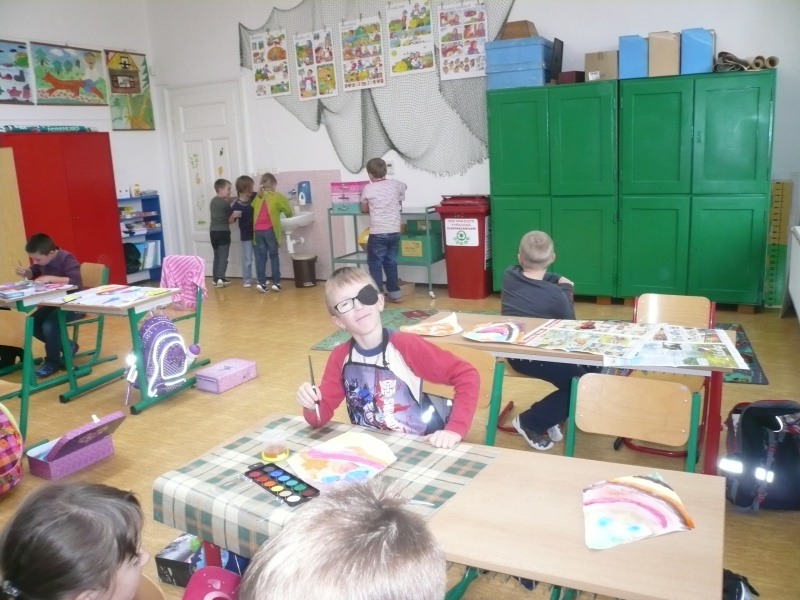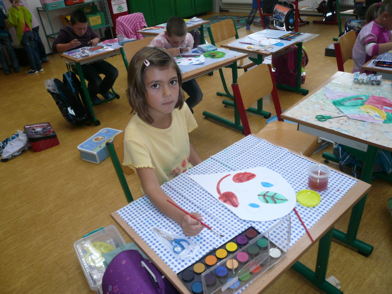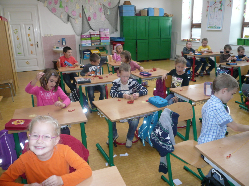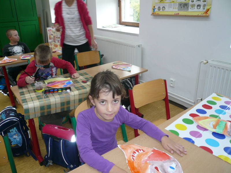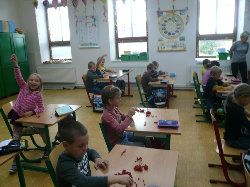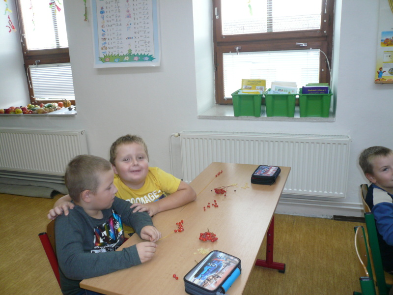 V průběhu měsíce září děti z 1. a 2. ročníku malovaly dráčky a vyráběly jim vlastnoručně ocásky. Dráčky malovaly podle své fantazie a učily se zacházet se štětci a barvami. V pracovních činnostech vyráběly řetězy z jeřabin a těstovin. Při práci trénovaly i drobnou motoriku důležitou pro nácvik psaní. Třída se rozzářila podzimními barvami.